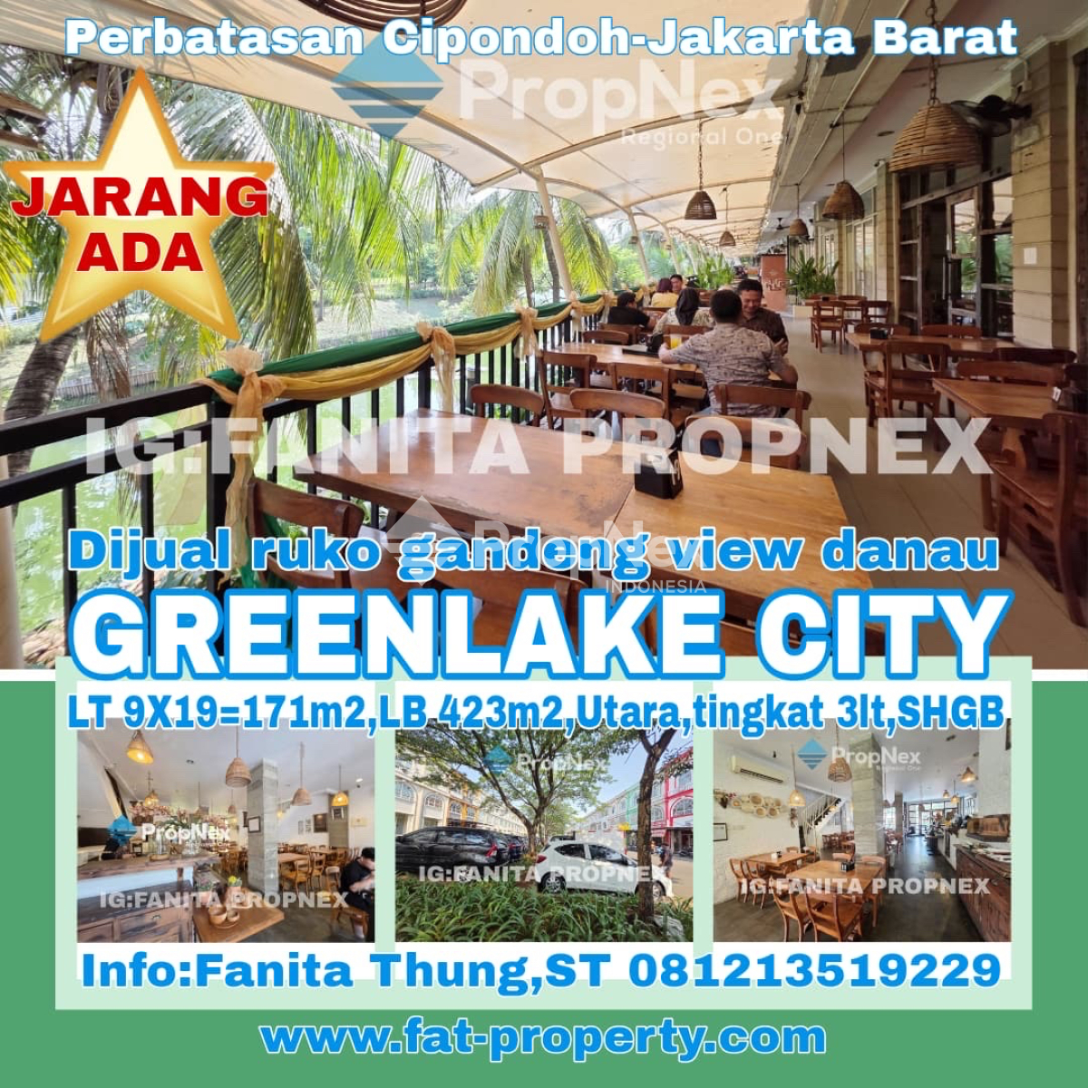 Jarang ada! View danau! Dijual ruko gandeng view danau di Food City,Greenlake City. LT 9X19=171m2 LB 423m2 Tingkat 3lt Hadap Utara View super keren di belakang menghadap danau. SHGB Sekarang masih dipakai sebagai restaurant. Parkir luas. Lokasi strategis di tengah2 perumahan Greenlake City,dekat ke pintu tol. Berada di perbatasan Jakarta Barat dan Tangerang. Harga murah Rp12Milyar Info hubungi: Fanita Thung,ST (PropNex Region One) Youtube: FAT PROPERTY Instagram: Fanita Propnex