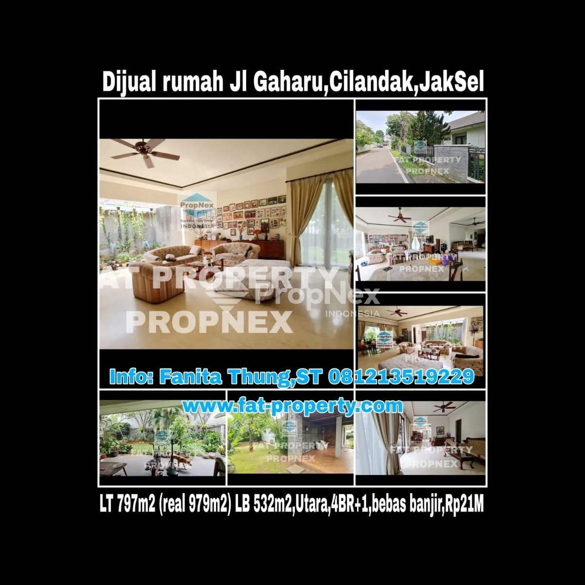 rumah asri di Jl Gaharu,Cilandak,JakSel LT 797m2 (real 979m2) LB 532m2 Lebar 28 meter 4BR+3 Garasi 2,carport 2 Taman depan,samping dan belakang. Taman belakang bisa dibangun kolam renang. Listrik 13rb Watt Utara Sederetan rumah Lesty Kejora Tidak pernah banjir sama sekali. Hanya 4,4km(11 menit) dari Pondok Indah Mal, Hanya 4,9km (13 menit) dari Lippomal Kemang, Hanya 7,7km(18menit) dari Plaza Senayan, Hanya 63km(37menit) dari Airport Soekarno Hatta. Harga Rp 21M Info Fanita Thung,ST (PropNex Kmg) Youtube fat property Instagram fanitapropnex